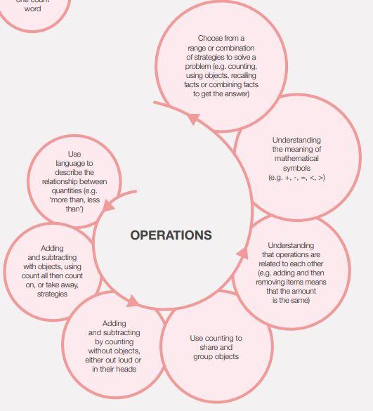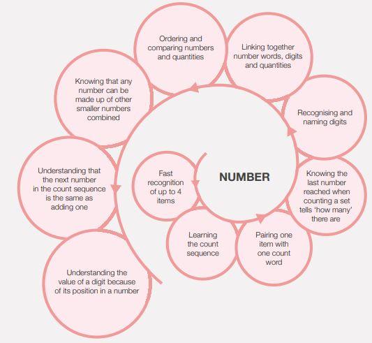 It is vital that children have a deep understanding of numbers in order to be able to access more complex maths as they progress through school. Children should be able to match numerals to amounts, understand numbers can be made and partitioned in different ways, and be able to use known facts to derive new knowledge. Research showing how children’s number sense develops over time can be seen in the images below (click to enlarge):