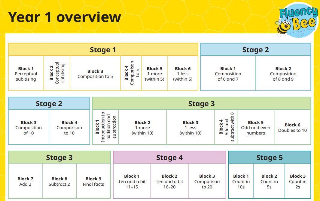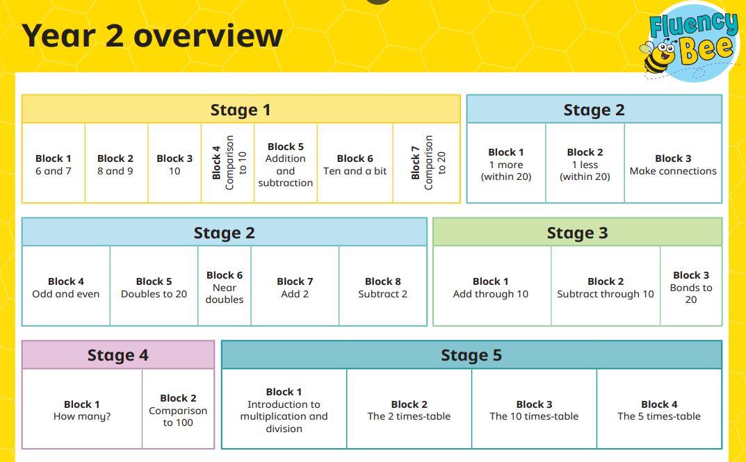 This focus on number sense continues into KS1, where we are introducing the White Rose Fluency Bee programme from Autumn 2023. This is a structured teaching programme designed to give children confidence with numbers and develop core maths skills. It is taught in discrete 10-15 minute sessions with hands-on activities, various representations of number and lots of mathematical talk between the children.